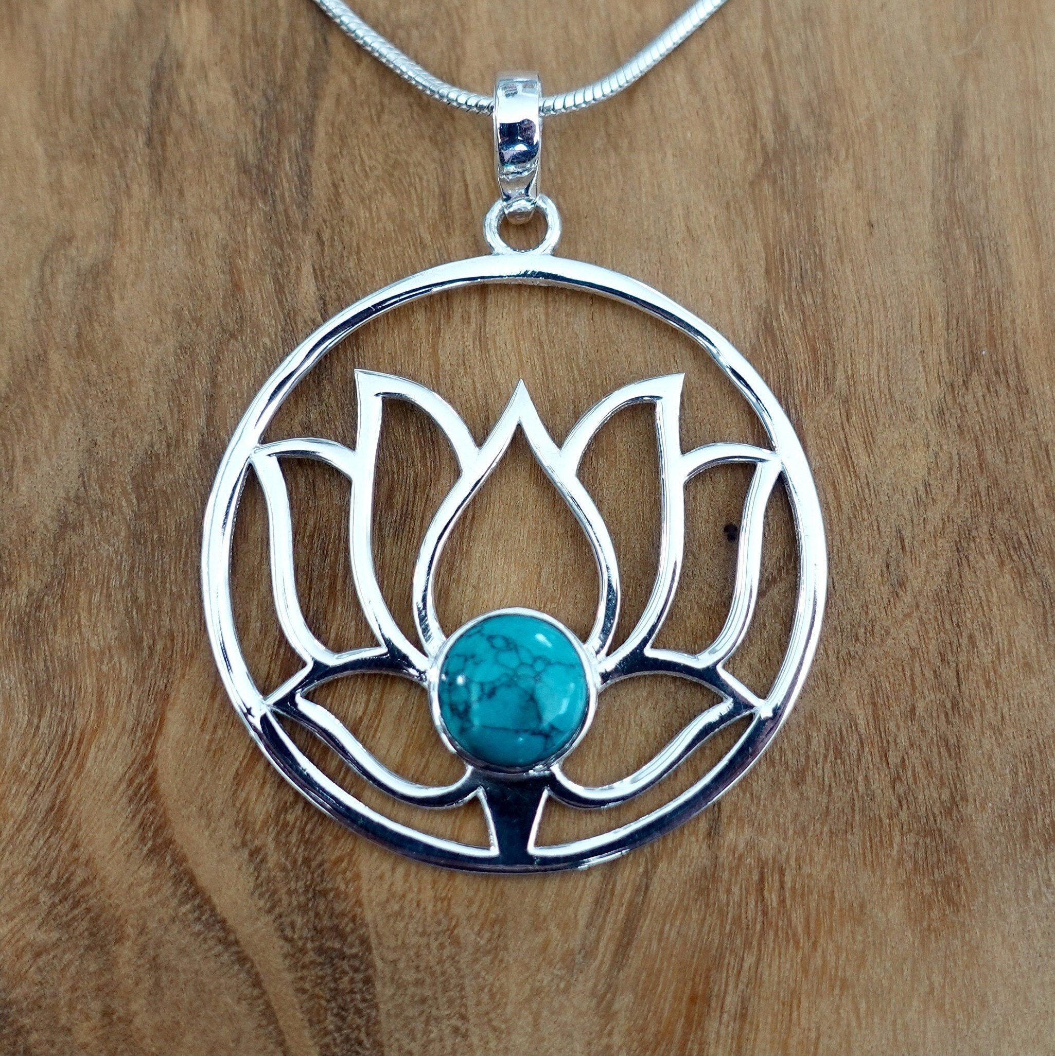 Large Turquoise Pendant Lotus Flower Silver Pendant Etsy